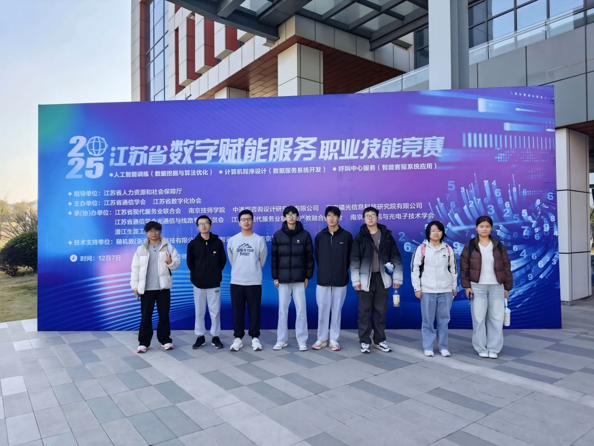 12月7日,2025年江苏省数字赋能服务职业技能竞赛在南京圆满落幕。本次竞赛经省人社厅备案为2025年“江苏工匠”岗位练兵职业技能省级一类竞赛活动。本次比赛设置人工智能训练(数据挖掘与算法优化)、计算机程序设计(数据服务系统开发)、呼叫中心服务(智能客服系统应用)三大个人赛项,全省各地市选拔赛总计参与人数2000余人,最终423名选手进入省赛。参赛学生合影 我校比赛团队由图文信息中心牵头组织