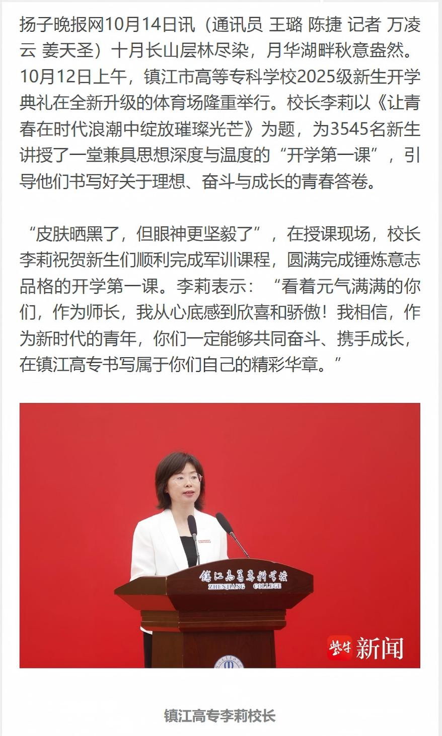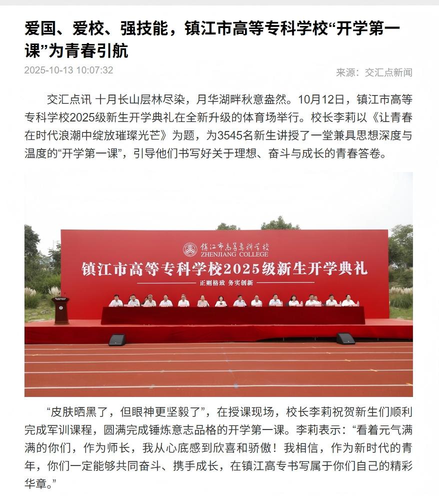 交汇点|紫牛新闻|爱国、爱校、强技能,镇江市高等专科学校“开学第一课”为青春引航 信息来源:宣传部发布时间:25.10.13阅读次数:125 媒体链接:交汇点:https://jhd.xhby.net/share-webui/detail/s68ec5ee4e4b00d37c2454be6紫牛新闻:https://wap.yzwb.net/wap/news/4802412.html
