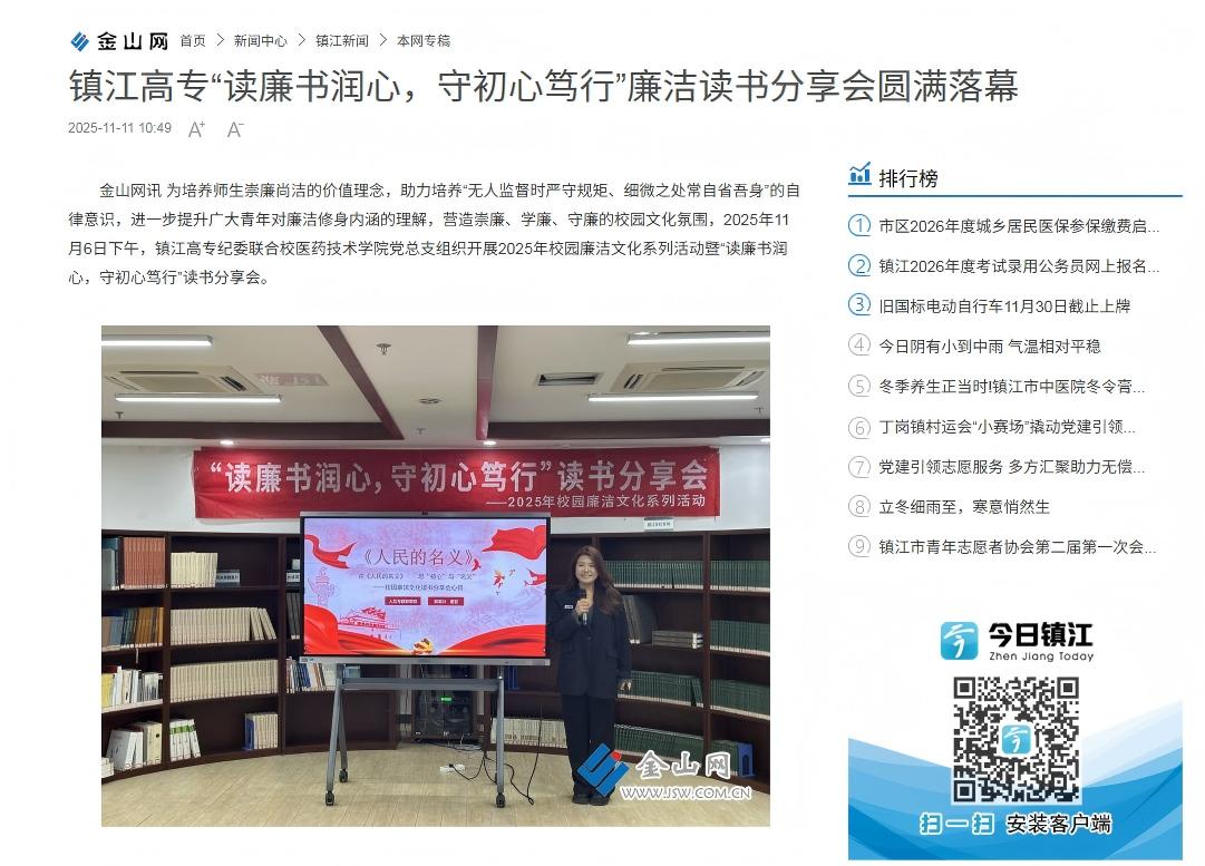 金山网|镇江高专“读廉书润心,守初心笃行”廉洁读书分享会圆满落幕 信息来源:医药技术学院发布时间:25.11.11阅读次数:579 媒体链接:金山网:https://www.jsw.com.cn/2025/1111/1931052.shtml
