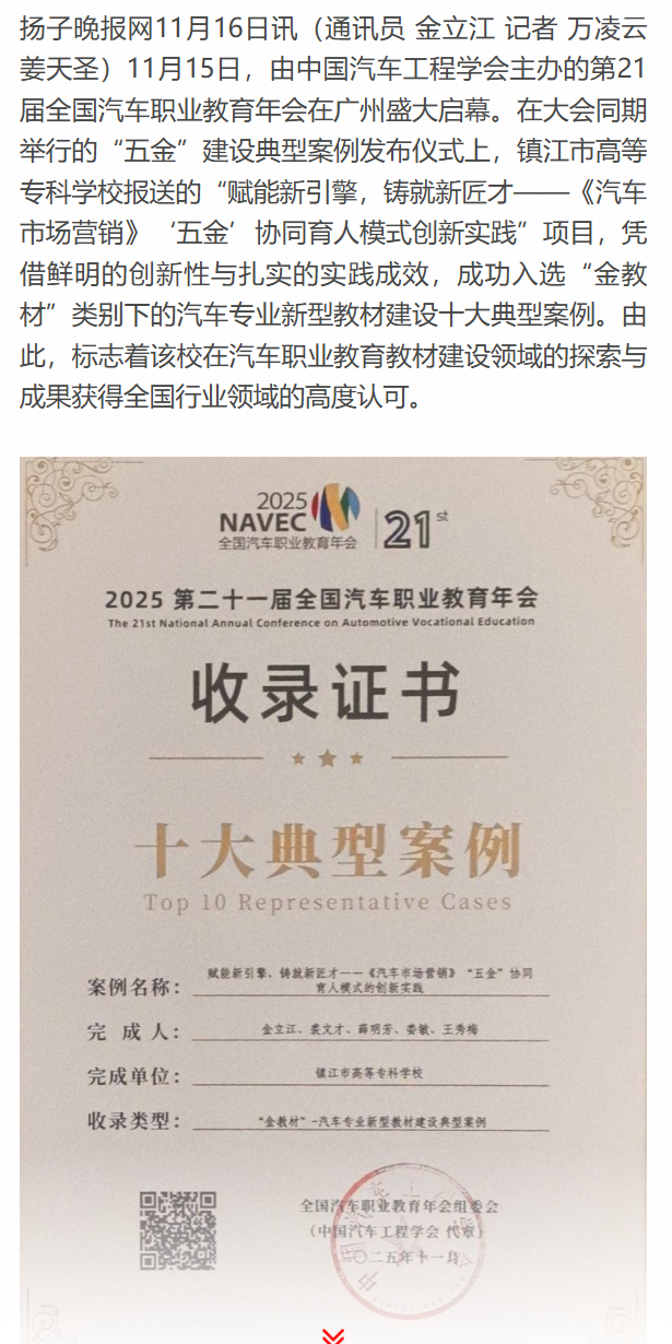 紫牛新闻|祝贺!镇江市高等专科学校《汽车市场营销》入选 “五金” 建设 “金教材” 案例 信息来源:团委、关工委发布时间:25.11.17阅读次数:350 媒体链接:紫牛新闻:https://wap.yzwb.net/wap/news/4848562.html