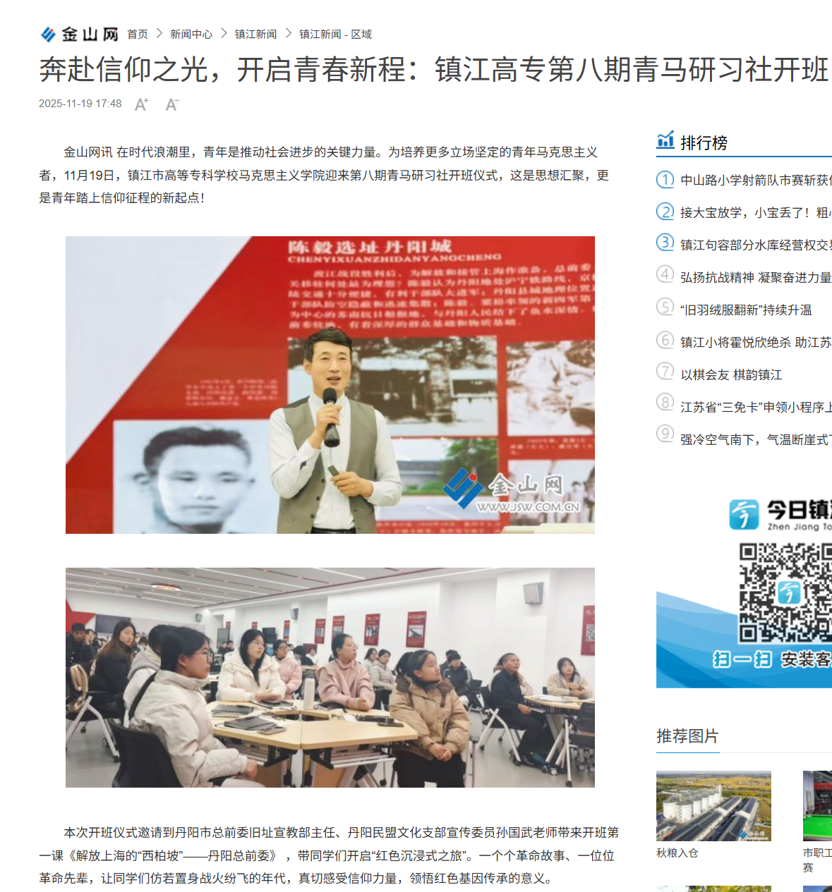 金山网|奔赴信仰之光,开启青春新程:镇江高专第八期青马研习社开班 信息来源:马克思主义学院发布时间:25.11.20阅读次数:438 媒体链接:金山网:https://www.jsw.com.cn/2025/1119/1932726.shtml