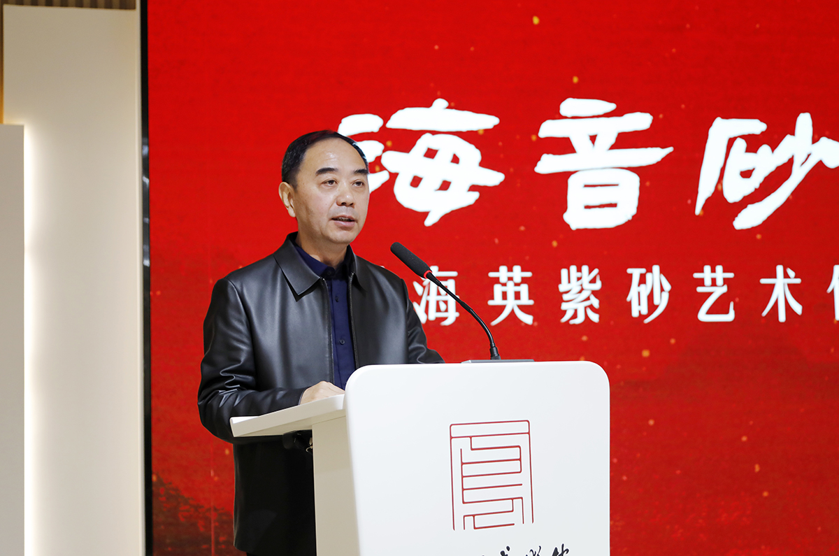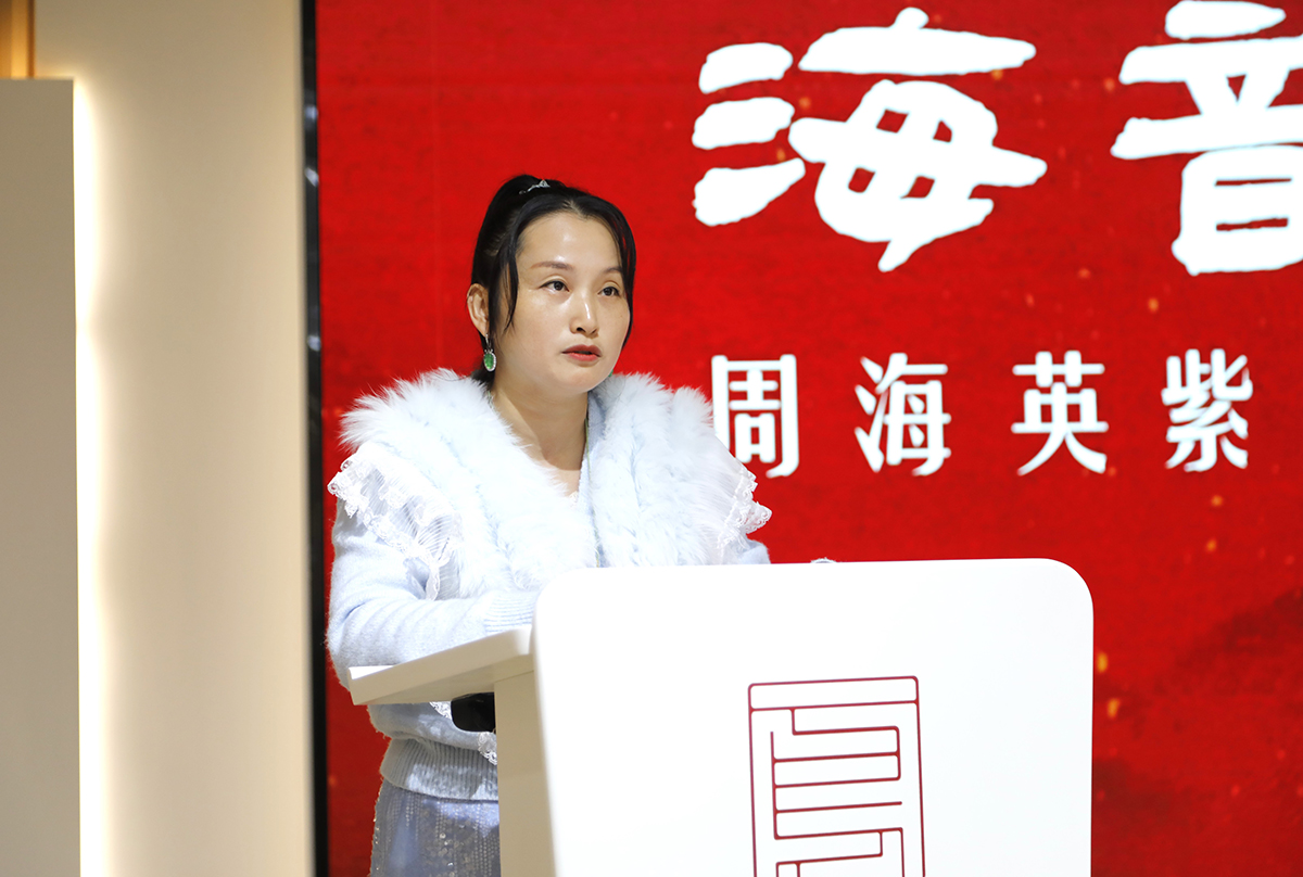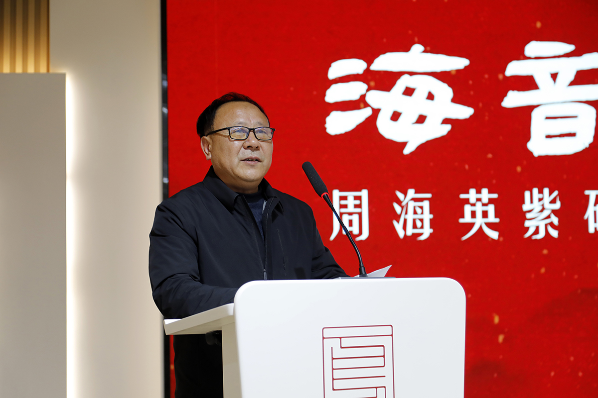 镇江市篆刻艺术推广协会副会长冷耀明代表主办方致辞。冷耀明指出,本次展出的作品,或古朴典雅、意境悠远,延续着紫砂艺术的经典文脉;或大胆创新、灵动别致,展现着青年创作者的独特思考,充分彰显了周海英作为新时代青年艺术家的才情与担当。