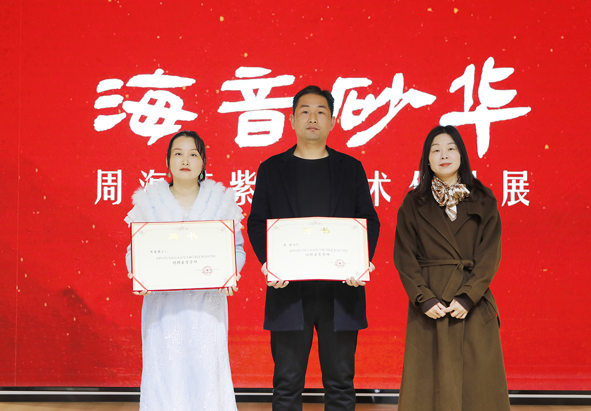 学校艺术设计学院党总支书记凌蕾花向紫砂艺术家周海英、吴俊颁发“美育特聘导师”聘书