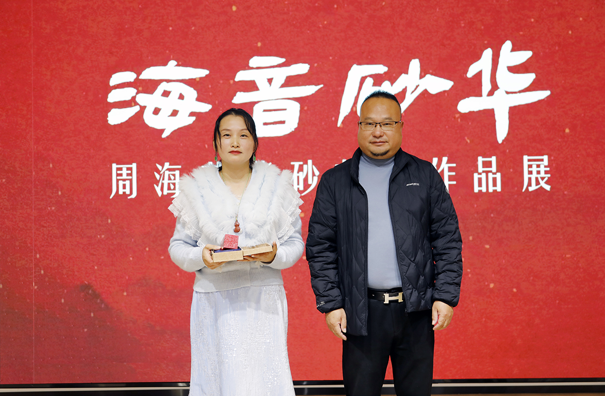 代表主办方向周海英赠送了展览主题印——海音砂华