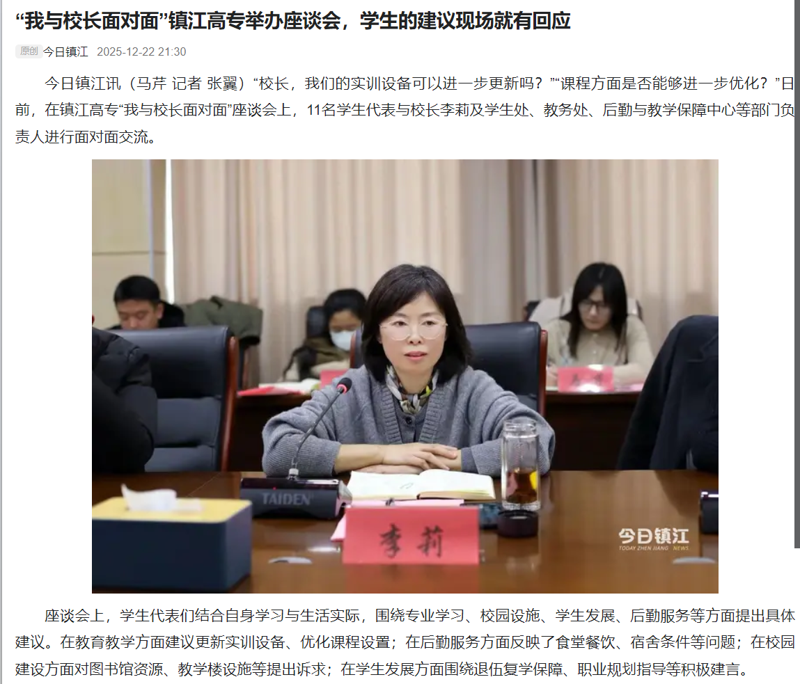 今日镇江|“我与校长面对面”镇江高专举办座谈会,学生的建议现场就有回应 信息来源:zjgz发布时间:26.01.04阅读次数:396 媒体链接:今日镇江:https://h5-x.jrzjapp.cn/davmu/share/holly/doc/2025/12/MQ457Unhv/index.html