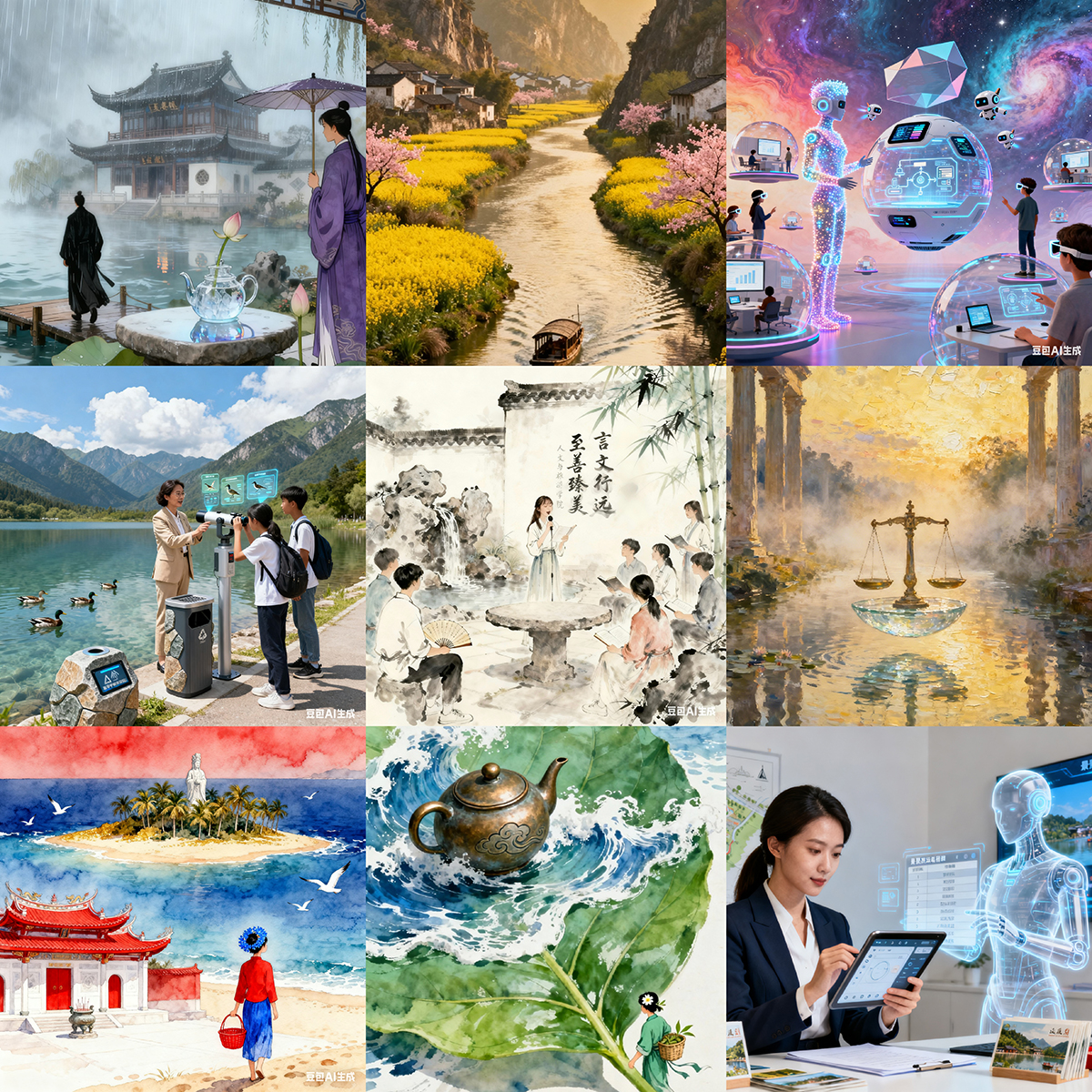 为积极探索人工智能与专业教学的融合创新,近日,人文与旅游学院分工会面向学院全体教师发起举办了“指尖万象 ,AI赋新韵”AI创意绘画征集活动。本次活动以“零门槛、重创意”为原则,鼓励教师大胆尝试,运用AI绘图工具重新诠释专业内涵,以科技画笔焕发学科新魅力,为学院智慧文旅建设注入创新动能。 活动不仅是一次艺术创作的生动实践,更是一场跨学科的思想碰撞与教学相长。教师们结合旅游管理、酒店管理、文秘、